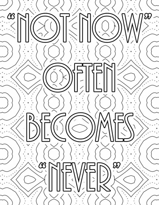 "Not Now" Often Becomes "Never" Stop Procrastinating PLR Coloring Page - Inspirational Content with Private Label Rights